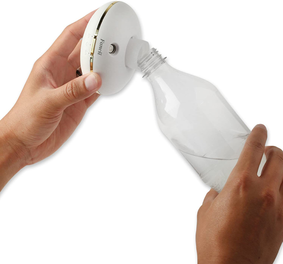 The genius of the Fancii is it converts any standard-sized plastic water bottle into a moisture-producing tank. You uncap the water bottle, attach the Fancii, turn it over, and turn it on. Voilà! Bring on the mist.