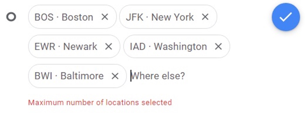 Google Flights allows a maximum of 5 departure airports. Sometimes you can trick it to listing more than five by selecting area airports as one choice (such as New York City), but the info isn’t always complete, so I recommend picking specific airports instead, such as this: