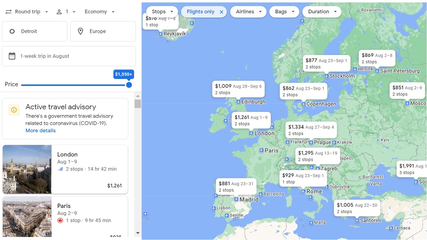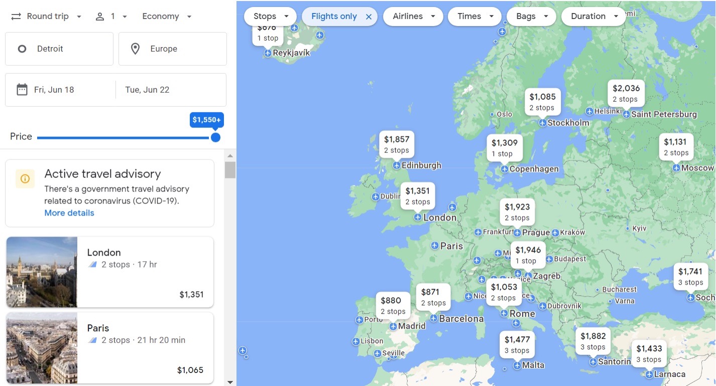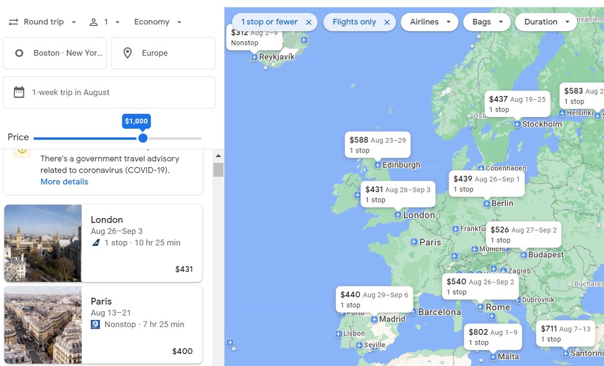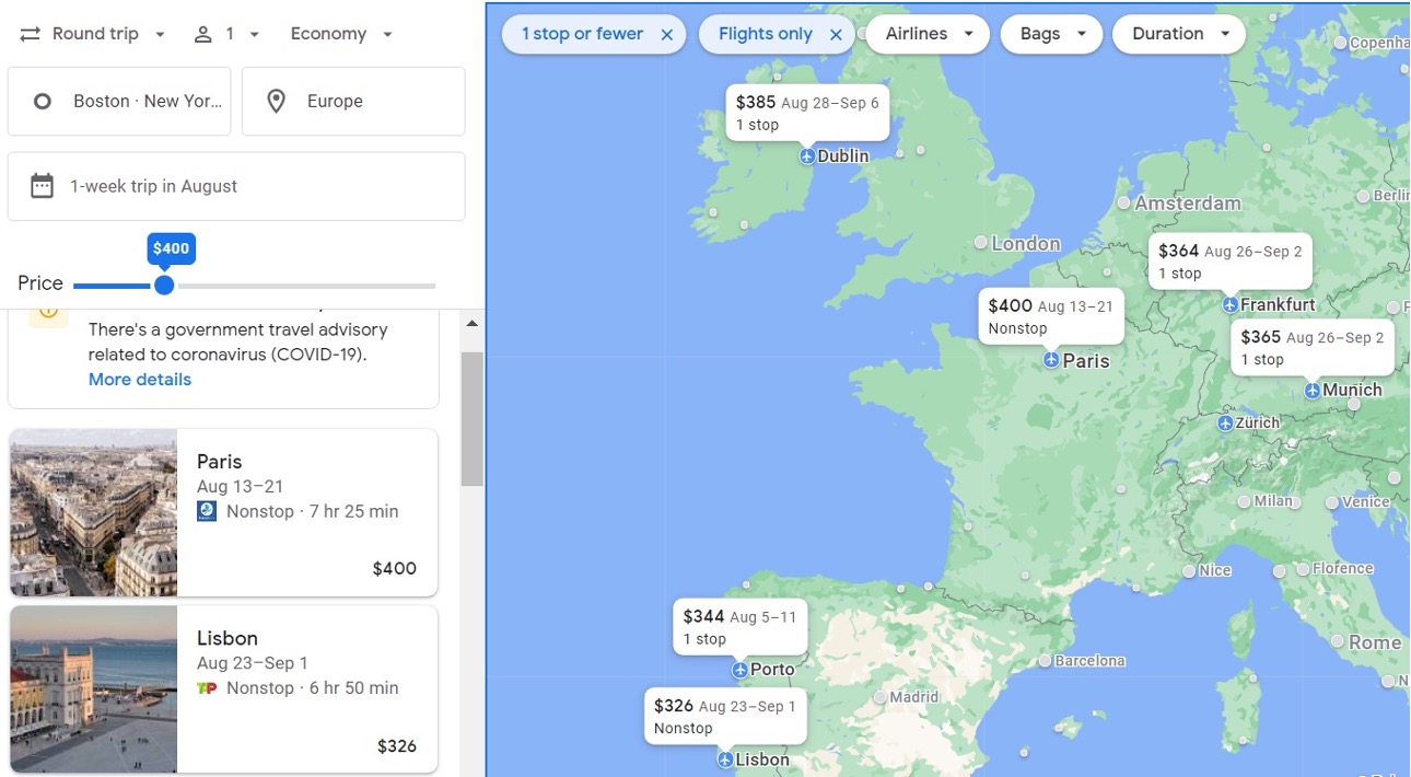 By dragging the price slider to the left, you can more easily see the cheapest available destinations. Using the slider to reduce the maximum price to $400 round-trip from the U.S. to Europe produces several options: Dublin for $385, Paris for $400, Frankfurt for $364, Munich for $365, Porto for $344, and Lisbon for $326. Those are great prices, especially in the summer!
