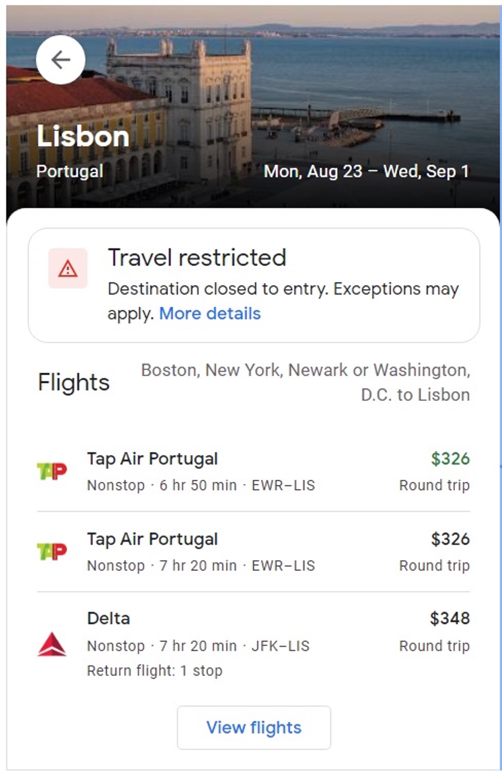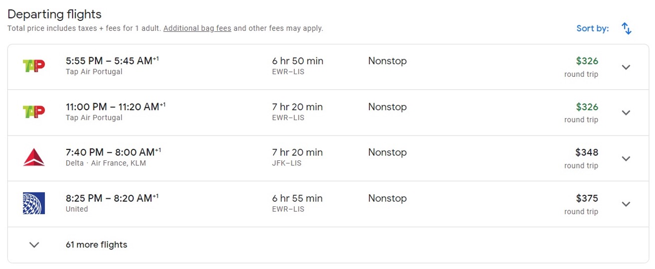 I clicked on a flight to Lisbon for $326 round-trip. Google Flights showed a few options: Tap Air Portugal from Newark to Lisbon for $32 and Delta from JFK to Lisbon for $348: