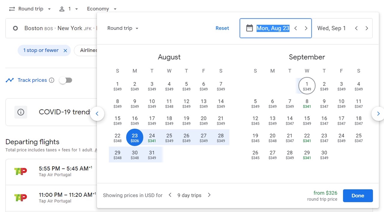 In this example, only one departure date is available for $326 round-trip, but $349 rates are available every day.