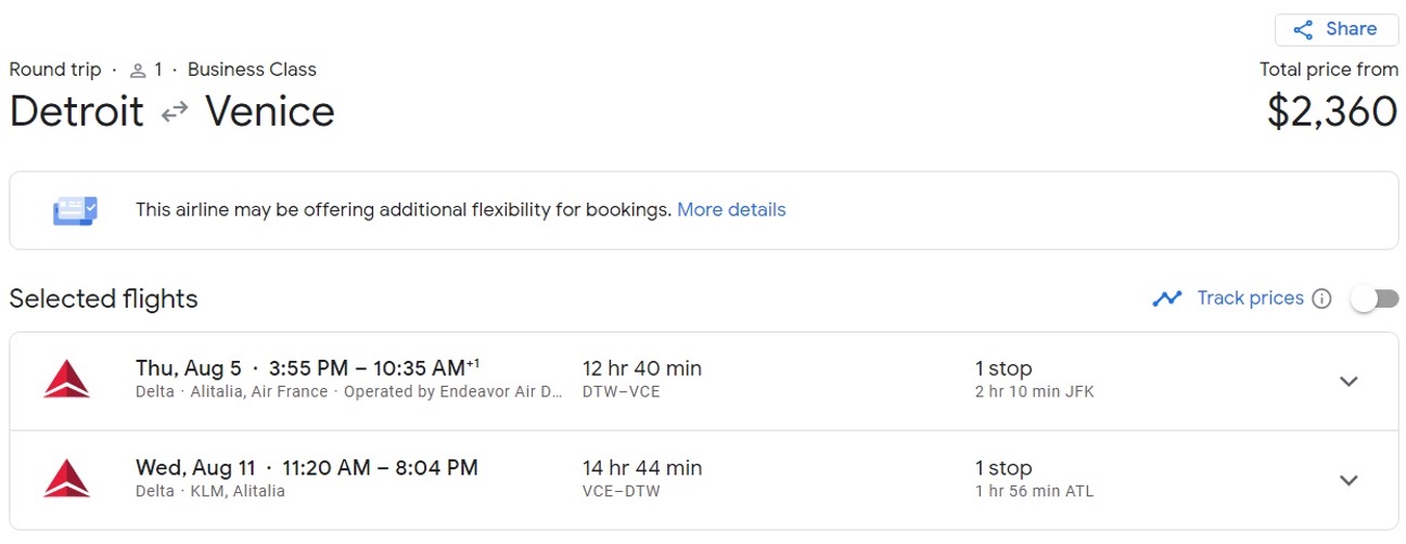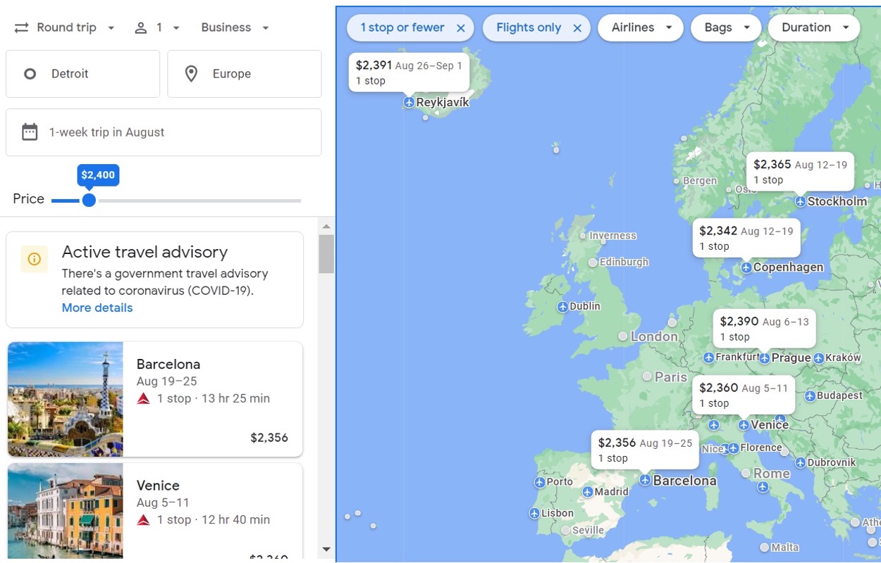You can use this technique to find business class deals as well. For example, I found a number of 1onestop round-trip flights from Detroit to Europe for less than $2,500. That’s not super-cheap, but it’s very good for Detroit departures, especially for summer travel: