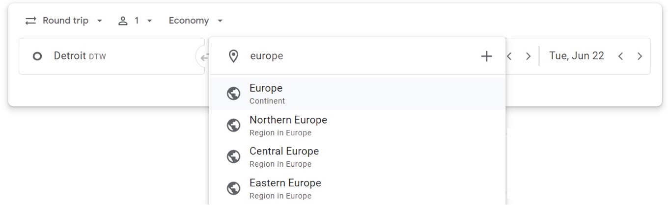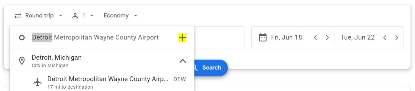 If you live close to multiple airports, click the departure airport and then click the plus symbol (+) in order to add additional locations. In the Detroit example above, you should add the Flint, Michigan airport, the Lansing, Michigan airport, and the Toledo, Ohio airport, as they are all not too far away.