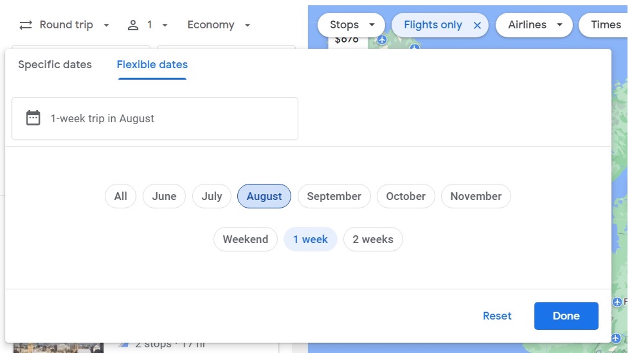 Click either the start date or end date to bring up a date selector pop-up. Click on “Flexible dates” and choose from the options presented. For this example, I picked a one-week trip in August by selecting “August” and “1 week”: