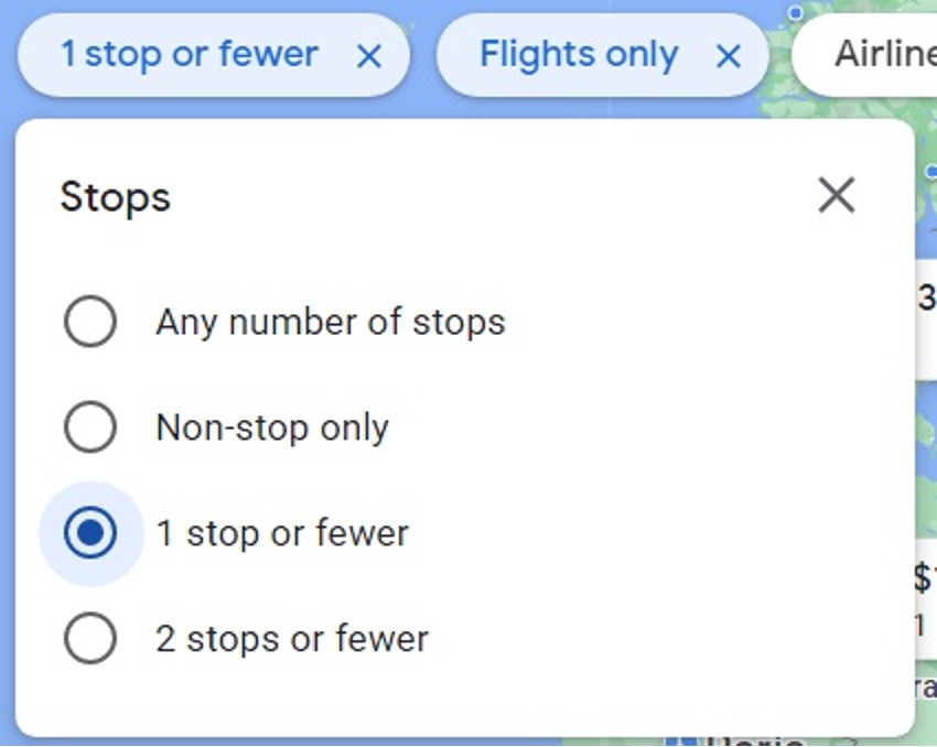Most of the deals that came up require two stops. As I wanted only one-stop options, I changed my preference on the drop-down menu on the map: