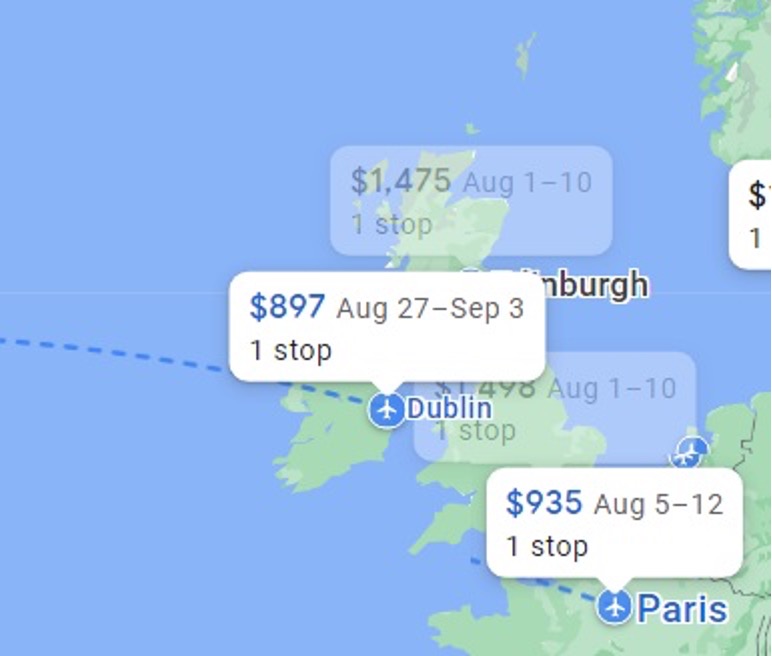 For example, in the map above, neither Paris nor Dublin were shown with prices, but by hovering over each, their prices came up: