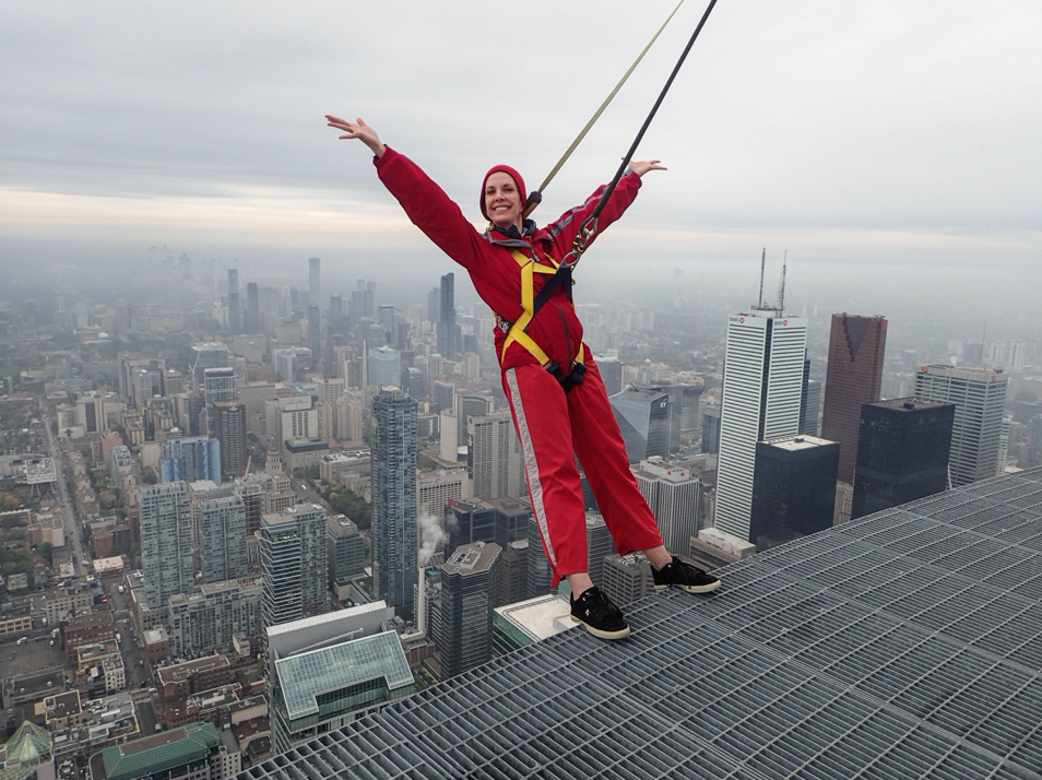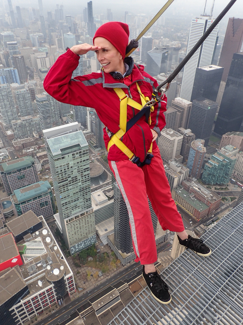 I did. And—to my surprise—I wasn’t as scared anymore. Instead, I gazed with wonder over the city and Lake Ontario. Jordan put us through our paces—heels over the edge, sitting in space, one leg extended—while pointing out Toronto’s landmarks as we made our way around the tower.